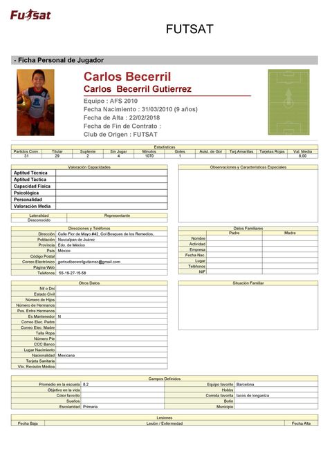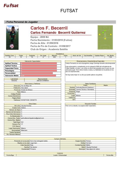 Al final de cada temporada a los futbolistas se les entrega una ficha técnica donde puede ver cuantos minutos jugó, su asistencia a entrenamientos y algunas observaciones de su Formador.