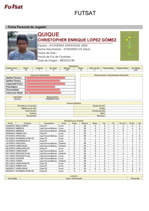 Al final de cada temporada a los futbolistas se les entrega una ficha técnica donde puede ver cuantos minutos jugó, su asistencia a entrenamientos y algunas observaciones de su Formador.