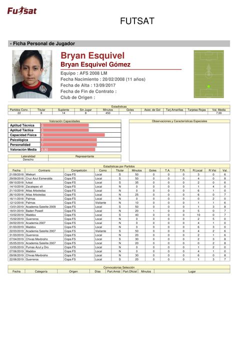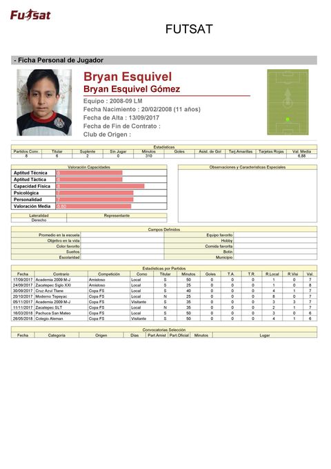 Al final de cada temporada a los futbolistas se les entrega una ficha técnica donde puede ver cuantos minutos jugó, su asistencia a entrenamientos y algunas observaciones de su Formador.