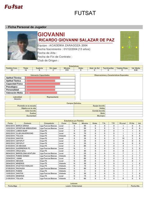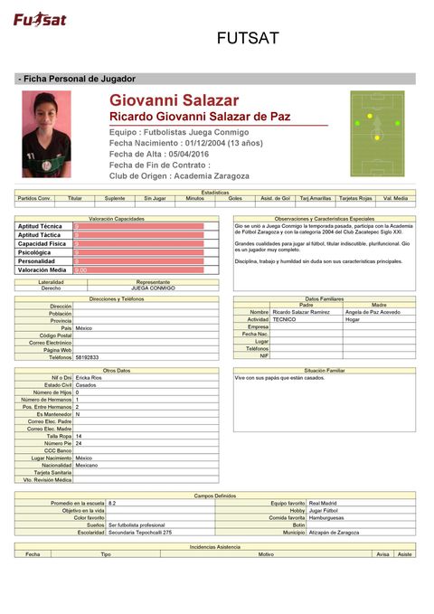 Al final de cada temporada a los futbolistas se les entrega una ficha técnica donde puede ver cuantos minutos jugó, su asistencia a entrenamientos y algunas observaciones de su Formador.