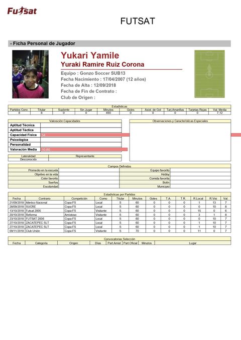 Al final de cada temporada a los futbolistas se les entrega una ficha técnica donde puede ver cuantos minutos jugó, su asistencia a entrenamientos y algunas observaciones de su Formador.